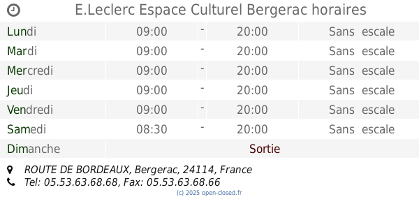 It is also possible to : Modifier ces HEURES D'OUVERTURE of Store E.Leclerc Espace Culturel Dans Bergerac, ROUTE DE BORDEAUX,